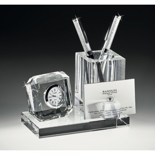 Ranoldi set scrivania in cristallo composto da un porta penne, un porta biglietti da visita e un orologio incorporato. Ottima idea regalo uomo donna per inaugurazione ufficio, per casa nuova o per compleanno.