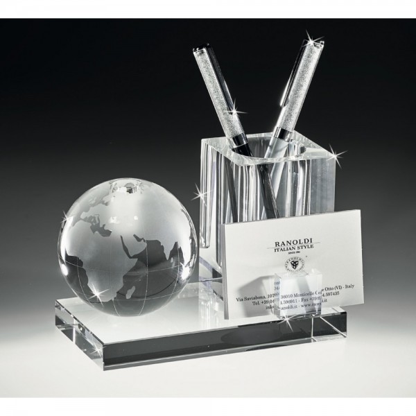 Ranoldi set scrivania in cristallo composto da un porta penne, un porta biglietti da visita e un un mappamondo incorporato. Ottima idea regalo uomo donna per inaugurazione ufficio, per casa nuova o per compleanno.