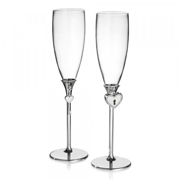 Ottaviani flute in cristallo con gambo in metallo argentato modello "innamorati" per via del lucchetto a forma di cuore pendente su un gambo e sull'altro una chiave.