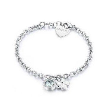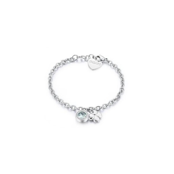 S''Agapo bracciale da donna della linea Lucky Light in acciaio 316L inossidabile e anallergico con pendente un cristallo Swarovsky di colore verde e ciondolo a forma di quadrifoglio porta fortuna. Chiusura regolabile con moschettone.
