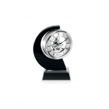 Orologio da tavolo firmato Ottaviani in metallo argentato tondo quadrante color argento con numeri romani e lancette nere. E' retto da un perno in alto da cui parte una base in legno nero lungo il semicerchio fino a confluire su un'altra base squadrata in legno nero. Il meccanismo è a vista sul retro. Dimensioni 8,6 x 17 cm, altezza 24.5 cm.