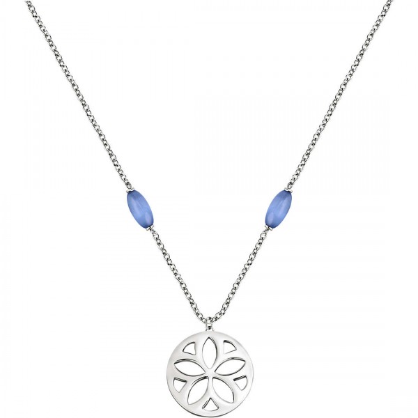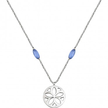 Morellato collana donna in acciaio con pendente un cerchio con il fiore all'interno e ai lati 2 pietre di occhio di tigre blu. Chiusura regolabile con moschettone