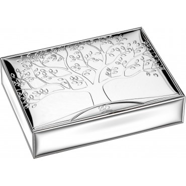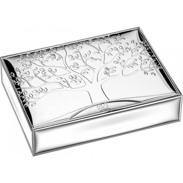 Atelier cofanetto o scatola porta gioie in lamina d'argento in lastra d'argento anche sui 4 lati moderno ed elegante grazie anche alla lavorazione che raffigura l'albero della vita e adatta a qualunque tipologia di arredo. In basso al centro sono incisi "25°" e le Fedi, perfetta da regalare per i 25 anni di Matrimonio.