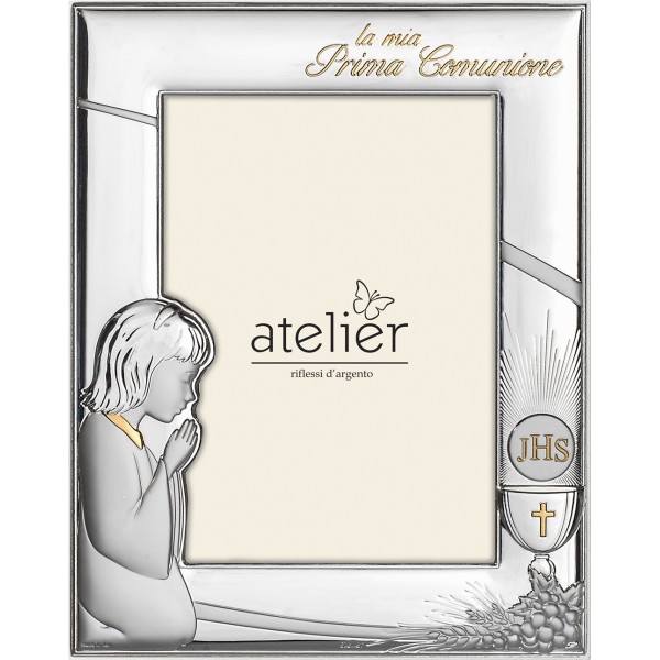 Atelier cornice portafoto in lamina d'argento e retro in legno raffigurante la bambina e il simbolo della Comunione, il calice con l'ostia in argento dorato. Perfetta da regalare per il giorno che si riceve la Prima Comunione, resterà per sempre un ricordo.