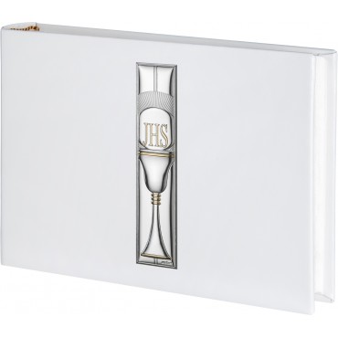 Atelier Argenti album in pelle bianca con placca in copertina in argento raffigurante il simbolo della Prima Comunione, il calice con l'ostia. Perfetto da regalare per il giorno che si riceve la Prima Comunione, resterà per sempre un ricordo.