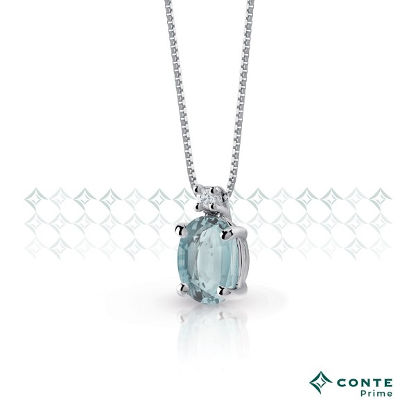 La collana certificata Conte Diamonds è in oro bianco rodiato 18 KT con acquamarina da 0.40 kt e diamante taglio brillante di carati 0,01 totali di colore F ( bianco eccezionale) purezza SI.
