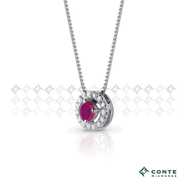La collana certificata Conte Diamonds è in oro bianco rodiato 18 KT con rubino da 0.20 kt e diamante taglio brillante di carati 0,07 totali di colore F ( bianco eccezionale) purezza SI.