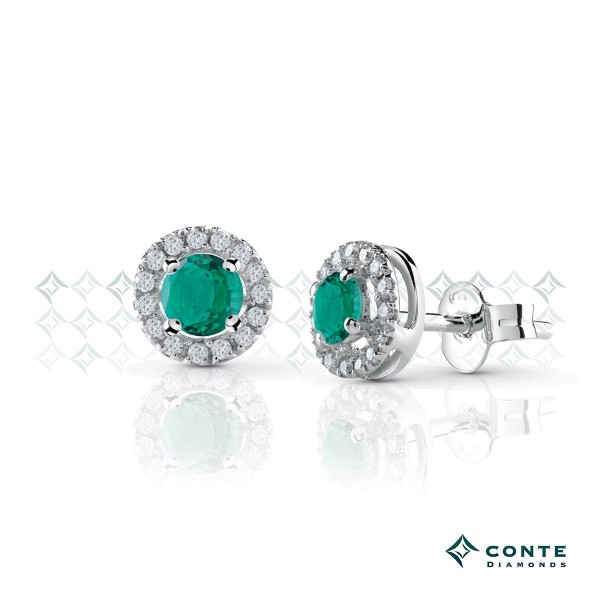 Gli orecchini certificati Conte Diamonds sono in oro bianco rodiato 18 KT con smeraldi da 0.30 kt totali e diamanti taglio brillante di carati 0,14 totali di colore F ( bianco eccezionale) purezza SI.