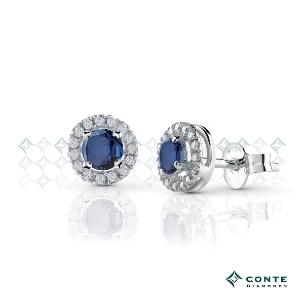 Gli orecchini certificati Conte Diamonds sono in oro bianco rodiato 18 KT con zaffiro 0.30 kt totali e diamanti taglio brillante di carati 0,14 totali di colore F ( bianco eccezionale) purezza SI.