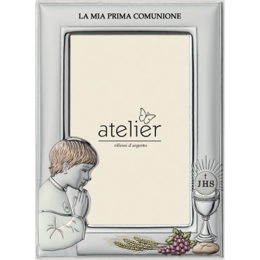 Atelier cornice portafoto in lamina d'argento e retro in legno raffigurante il bambino e il simbolo della Comunione, il calice con l'ostia, l'uva e la spiga. Perfetta da regalare per il giorno che si riceve la Prima Comunione, resterà per sempre un ricordo.