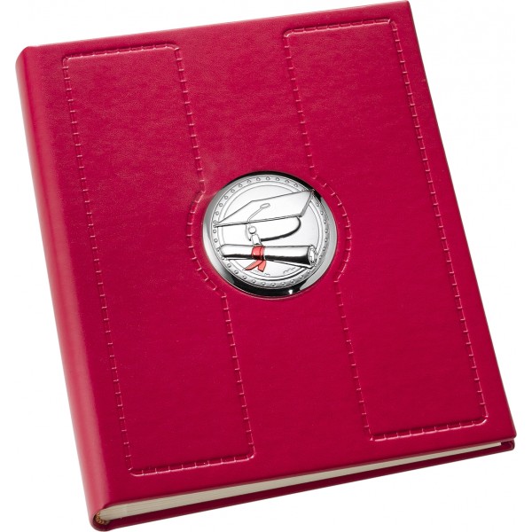 Atelier Argenti album in pelle rossa con placca in copertina in argento raffigurante il simbolo della laurea, il tocco e la pergamena. Perfetto da regalare per il giorno della Laurea, resterà per sempre un ricordo.