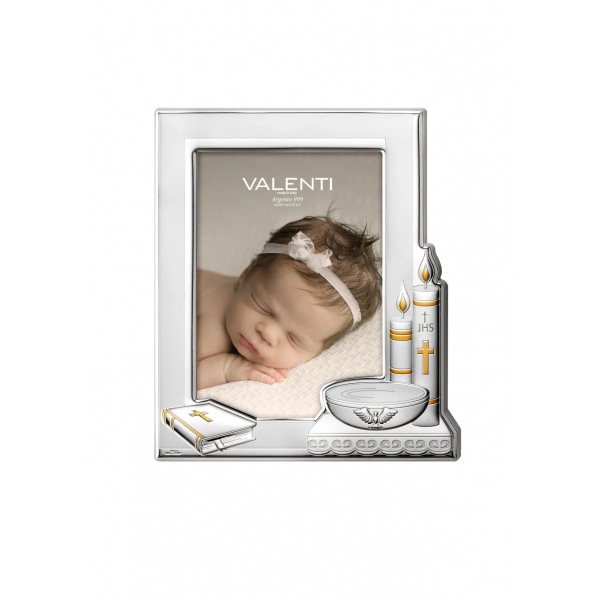 Valenti & Co. cornice portafoto in lamina d'argento e retro in legno bianco con il simbolo del Battesimo, fonte battesimale e candele in argento lucido e dorato. Perfetta come idea regalo per il giorno del Battesimo come un ricordo che dura tutta la vita.