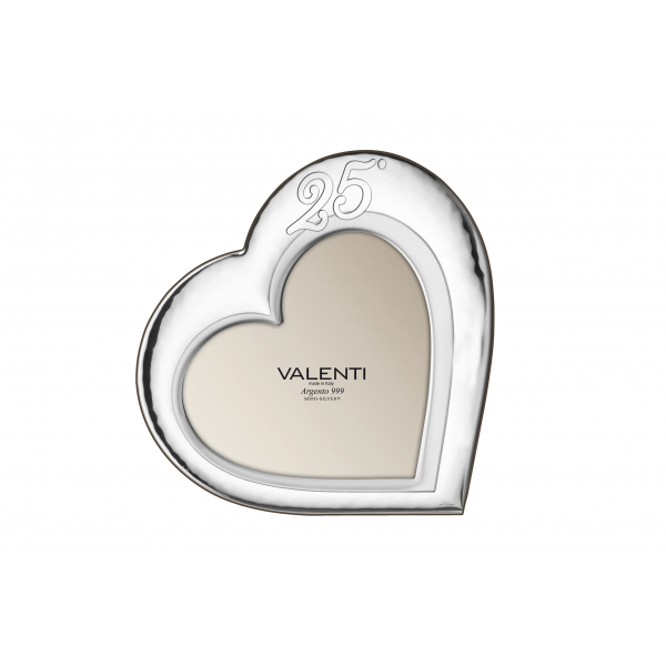 Valenti & Co. cornice portafoto a forma di cuore in lamina d'argento e retro in legno scuro elegante e raffinata adatta a qualunque tipologia di arredo con il 25° in rilievo perfetta come idea regalo per l'Anniversario delle nozze d'argento.