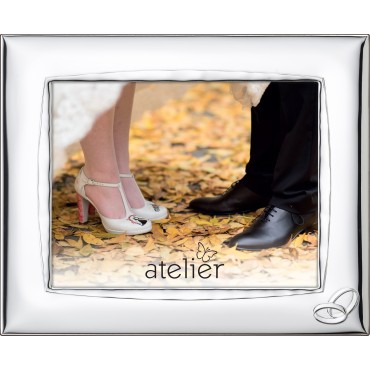 Atelier Argenti cornice portafoto liscia in lamina d'argento e retro in legno scuro elegante e raffinata adatta a qualunque tipologia di arredo, perfetta idea regalo per Matrimonio, con tanto di fedi in basso. Sul retro la cravatta permette l'orientamento verticale o orizzontale del portafoto. Sopra l'argento vi è una patina protettiva trasparente che lo preserva dallo scurimento nel tempo. Per questo non vanno in alcun modo spruzzati prodotti per l'argento o qualsiasi altro agente chimico, ma all'occorrenza, va utilizzato un panno morbido e asciutto per togliere la polvere. Il portafoto resta invariato nel tempo, pulito e lucente come appena acquistato. E' un ottima idea regalo per qualunque occasione, arreda la casa o l'ufficio con eleganza e stile.