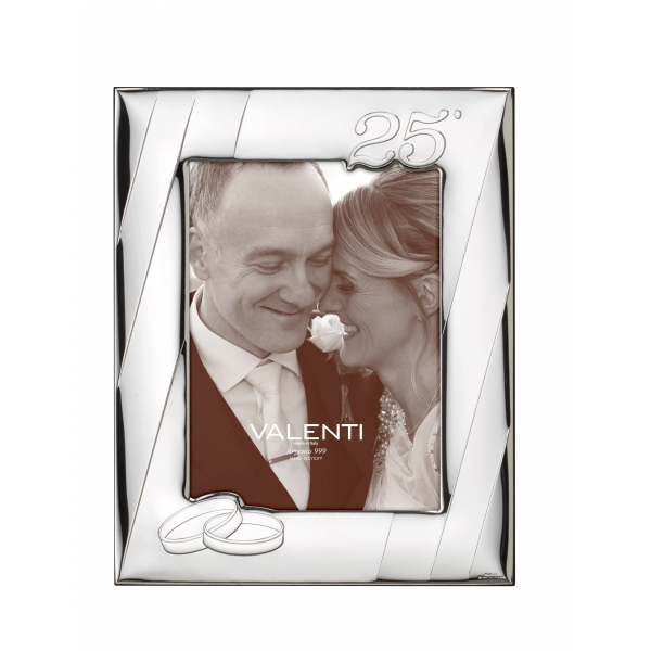 Valenti & Co. cornice portafoto in lamina d'argento e retro in legno scuro con il 25°, perfetta da regalare per l'Anniversario delle nozze d'argento, elegante e raffinata adatta a qualunque tipologia di arredo. Sul retro la cravatta permette l'orientamento verticale o orizzontale del portafoto.