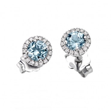Bliss orecchini a lobo da donna formati da 17 diamanti ognuno da 0.02 kt per un totale di 34 diamanti da 0.04 kt di colore G purezza VS incastonati intorno ad una acquamarina centrale da 0.20 kt l'uno per un totale di 0.41 kt. Montatura in oro bianco 18 kt a griffe e chiusura con farfallina in oro 750%.
