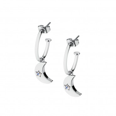 S'Agapo orecchini da donna della Linea Estrella in acciaio 316L inossidabile e anallergico a semicerchio con pendente a forma di luna con al centro un cristallo bianco. Chiusura con farfallina.