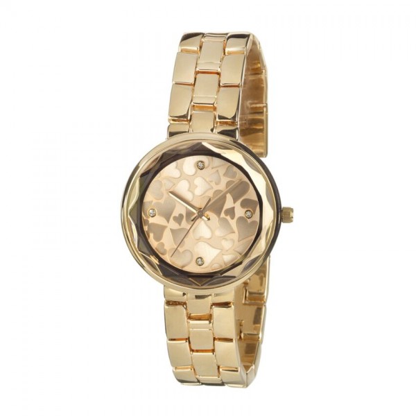 Ottaviani orologio da donna completamente in metallo dorato, anche il cinturino è a bracciale in metallo dorato. Movimento al quarzo con cassa in metallo dorato di diametro 34 mm sul fondo è ricco di cuori.