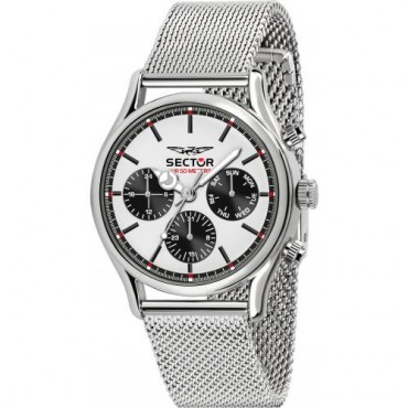 Sector orologio da uomo multifunzione della Collezione 660 è cronografo con cassa in acciaio quadrante bianco, lancette e indici sono di colore nero. Il bracciale dell'orologio è in maglia milano, con chiusura di sicurezza. Movimento al quarzo e resistente all'acqua fino a 5 atm.