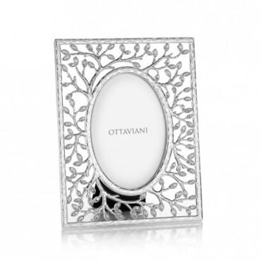 Cornice portafoto firmata Ottaviani in metallo argentato di forma rettangolare lavorata all'interno a forma di albero della vita le cui foglie sono arricchite da cristalli bianchi, al centro il portafoto si presenta a forma ovale con misura interna per la foto 10 x 15 cm. Misura del portafoto 21,8 x 16,7 cm.