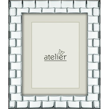 Atelier cornice portafoto effetto mattoncini in lamina d'argento e retro in legno scuro, modello Straw. Sul retro la cravatta permette l'orientamento verticale o orizzontale del portafoto. Sopra l'argento vi è una patina protettiva trasparente che lo preserva dallo scurimento nel tempo. Per questo non vanno in alcun modo spruzzati prodotti per l'argento o qualsiasi altro agente chimico, ma all'occorrenza, va utilizzato un panno morbido e asciutto per togliere la polvere. Il portafoto resta invariato nel tempo, pulito e lucente come appena acquistato. E' un ottima idea regalo per qualunque occasione, arreda la casa o l'ufficio con eleganza e stile.