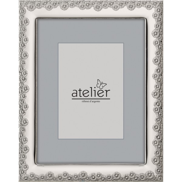 Atelier cornice portafoto con fiorellini su tutto il perimetro in lamina d'argento e retro in legno scuro modello Daisy. Sul retro la cravatta permette l'orientamento verticale o orizzontale del portafoto. Sopra l'argento vi è una patina protettiva trasparente che lo preserva dallo scurimento nel tempo. Per questo non vanno in alcun modo spruzzati prodotti per l'argento o qualsiasi altro agente chimico, ma all'occorrenza, va utilizzato un panno morbido e asciutto per togliere la polvere. Il portafoto resta invariato nel tempo, pulito e lucente come appena acquistato. E' un ottima idea regalo per qualunque occasione, arreda la casa o l'ufficio con eleganza e stile.