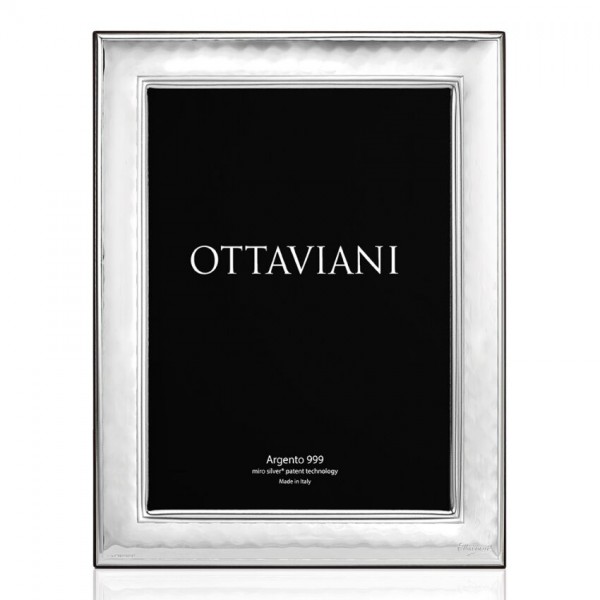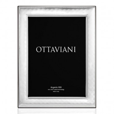 Cornice portafoto firmata Ottaviani modello "pepita" in argento e retro in legno, adatta su qualunque tipo di arredo. Misura interna per la foto 18 x 24 cm. Orientamento sia verticale che orizzontale.