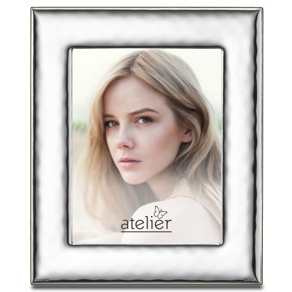 Atelier cornice portafoto martellata in lamina d'argento e retro in legno scuro elegante e raffinata adatta a qualunque tipologia di arredo, modello Caban. Sul retro la cravatta permette l'orientamento verticale o orizzontale del portafoto.