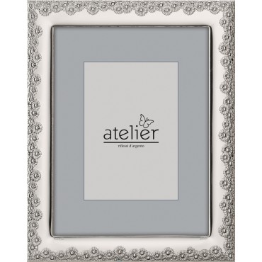 Atelier cornice portafoto con fiorellini su tutto il perimetro in lamina d'argento e retro in legno scuro elegante e raffinata adatta a qualunque tipologia di arredo modello Daisy. Sul retro la cravatta permette l'orientamento verticale o orizzontale del portafoto.