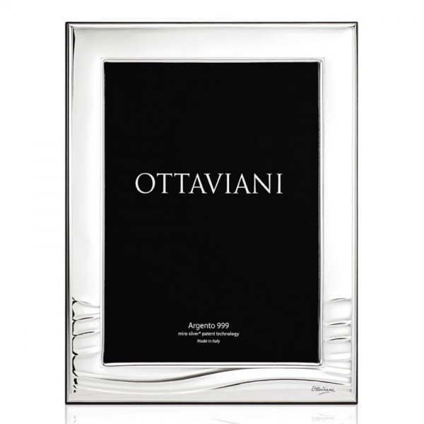 Cornice portafoto firmata Ottaviani modello "mare" in argento e retro in legno, adatta su qualunque tipo di arredo. Misura interna per la foto 13 x 18 cm. Orientamento sia verticale che orizzontale.