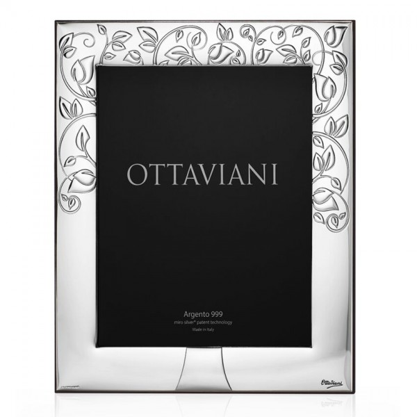 Cornice portafoto firmata Ottaviani modello "albero della vita" in argento e retro in legno, squadrata, adatta su qualunque tipo di arredo. Misura interna per la foto 20 x 25 cm. Orientamento sia verticale che orizzontale.