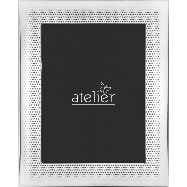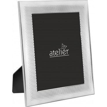 Atelier cornice portafoto martellata in lamina d'argento e retro in legno scuro elegante e raffinata adatta a qualunque tipologia di arredo, fascia larga. Sul retro la cravatta permette l'orientamento verticale o orizzontale del portafoto.