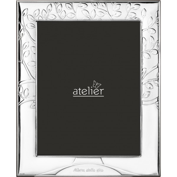 Atelier cornice portafoto in lamina d'argento e retro in legno scuro moderna ed elegante grazie anche alla lavorazione che raffigura l'albero della vita e adatta a qualunque tipologia di arredo. Sul retro la cravatta permette l'orientamento verticale o orizzontale del portafoto.