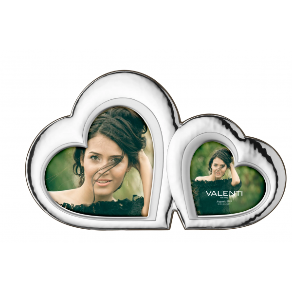 Valenti & Co. cornice portafoto a forma di doppio cuore in lamina d'argento e retro in legno scuro elegante e raffinata adatta a qualunque tipologia di arredo.
