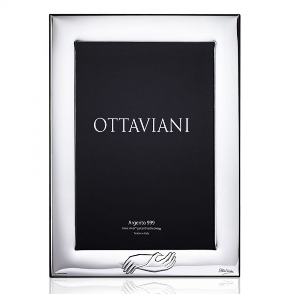 Cornice portafoto firmata Ottaviani modello "abbraccio" in argento e retro in legno, adatta su qualunque tipo di arredo. Misura interna per la foto 18 x 24 cm. Orientamento sia verticale che orizzontale. Rappresenta l'unione di mani, come fosse un abbraccio. Perfetta idea regalo per Matrimonio, Anniversario o da regalare alla coppia per l'inaugurazione di casa nuova.