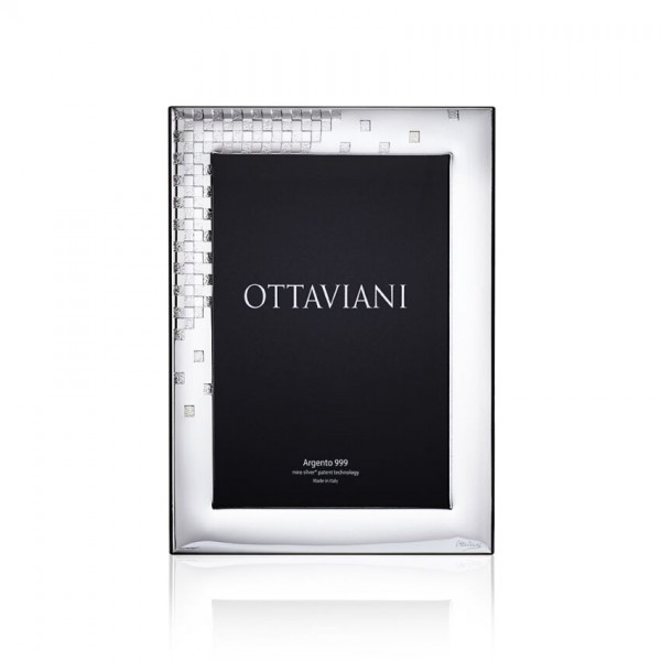 Cornice portafoto firmata Ottaviani modello "scacchi" in argento e retro in legno, adatta su qualunque tipo di arredo. Misura interna per la foto 9 x 13 cm. Orientamento sia verticale che orizzontale. Perfetta idea regalo per Matrimonio, Anniversario, inaugurazione di casa nuova o ufficio.