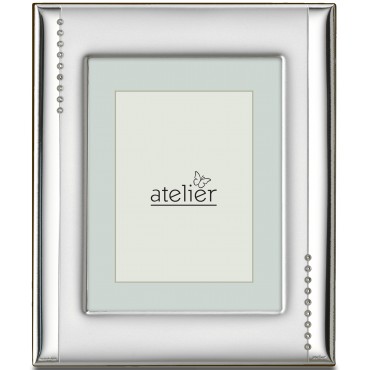 Atelier cornice portafoto in lamina d'argento lucido e satinato e retro in legno scuro elegante e raffinata impreziosita da una fila di swarovsky. Sul retro la cravatta permette l'orientamento verticale o orizzontale del portafoto.