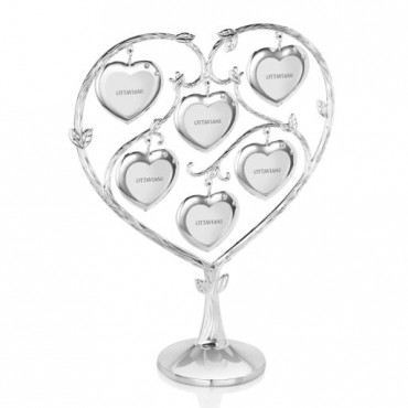 Ottaviani albero dell'amore inteso come albero genealogico a forma di cuore in metallo argentato su base tonda composto da rami e foglie lavorate da cui pendono 6 piccole portafoto a forma di cuore con formato interno per la foto 4 x 4 cm.