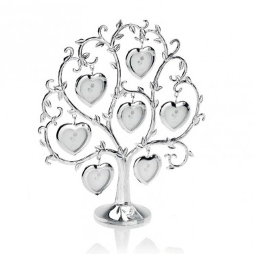 Ottaviani albero della vita inteso come albero genealogico in metallo argentato su base tonda composta da rami e foglie lavorate da cui pendono 7 piccole portafoto a forma di cuore con formato interno per la foto 4 x 4 cm.