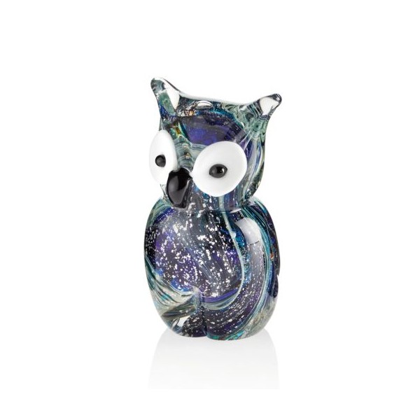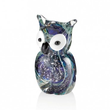 Scultura firmata Ottaviani a forma di gufo in vetro di murano sulle sfumature dal verde al blu, alto 12,5 cm.